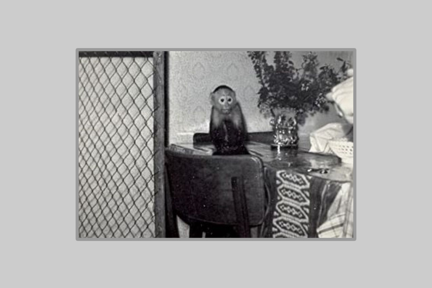 Mijn man kwam op een dag met een aap in een papegaaienkooi binnen. Ik zei: "Hoe kom je daar nou weer aan?" Gevonden in de kofferbak van een sloopauto. Die baas van de sloop zei: "Wij moeten hem niet hoor, neem maar mee." Dus zodoende had hij hem meegenomen. Hij beet gelijk in mijn vinger. Dat voelde ik behoorlijk. Maar goed, het beestje was bang. Toen heeft Edward in de hoek van de kamer een kooi gemaakt waar hij in kon. Af en toe ontsnapte hij en als we dan niet thuis waren, moesten alle planten het ontgelden. Er stonden lege bloempotten voor het raam. Als ik dan riep: "Wat heb je nou gedaan Muus?" Gaf hij een paar schreeuwen. Hij kon ook heel lief zijn en met je haar kroelen. Hij ging ook mee in de auto, dan lag hij op het dashboard. En mee het park in, hij ging dan een boom in maar kwam ook weer terug. (Ge)